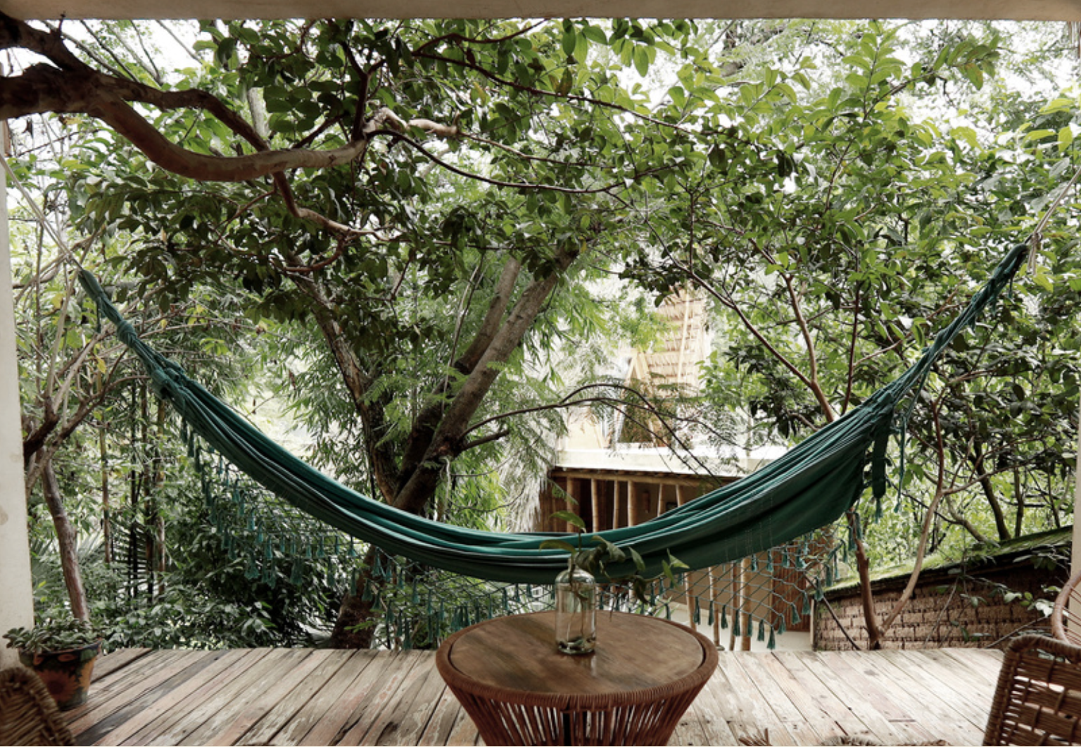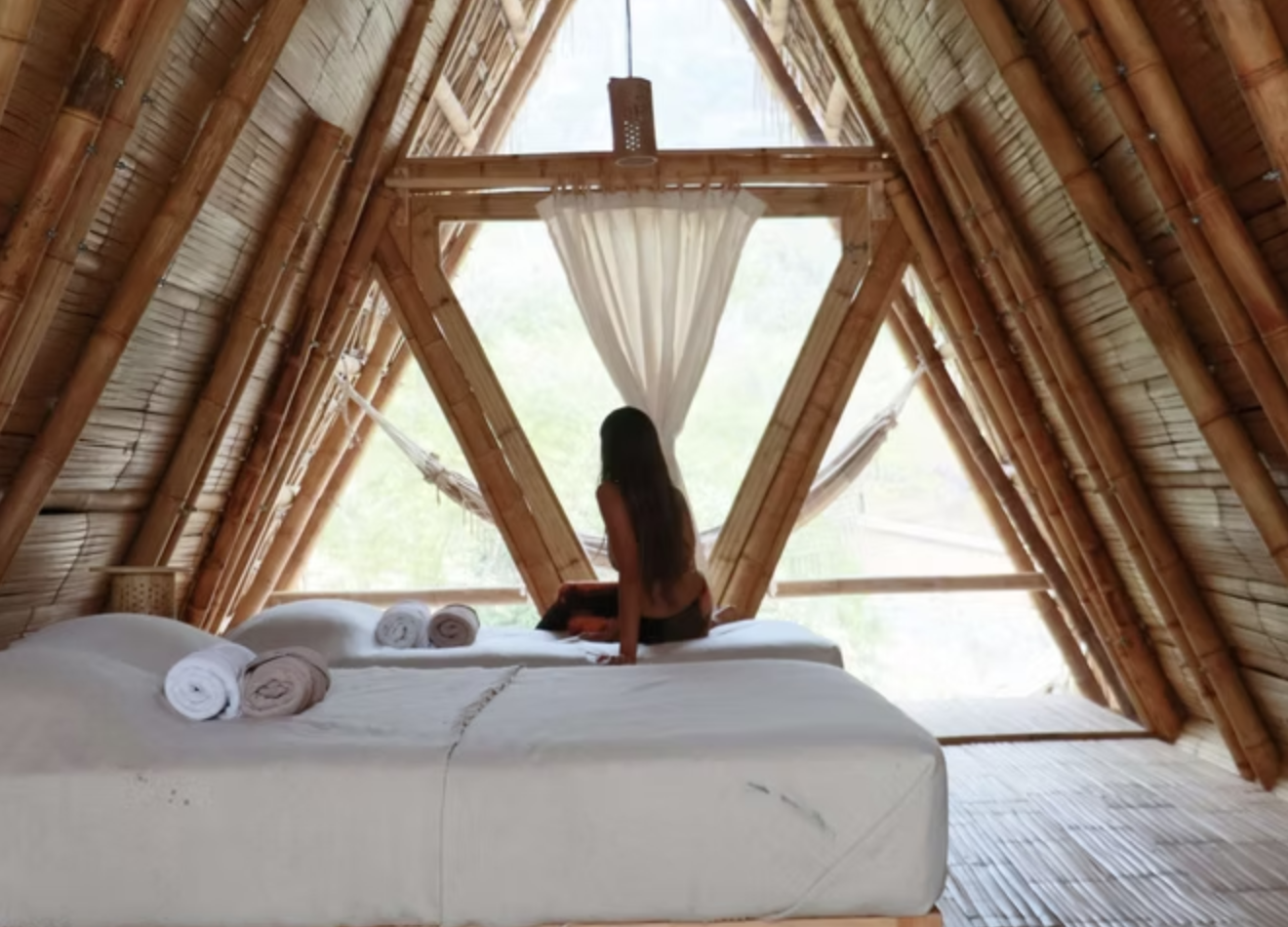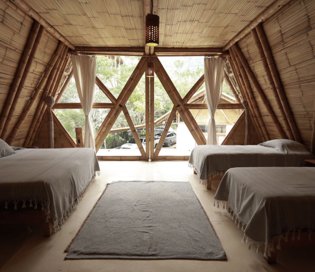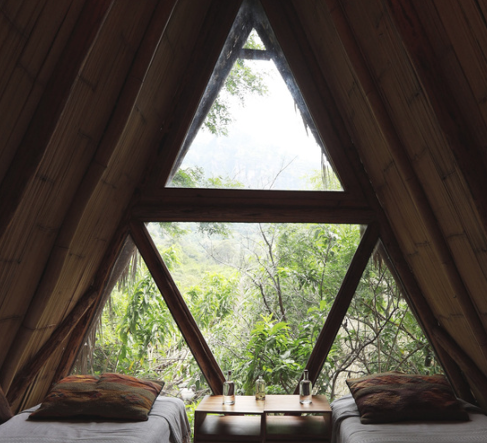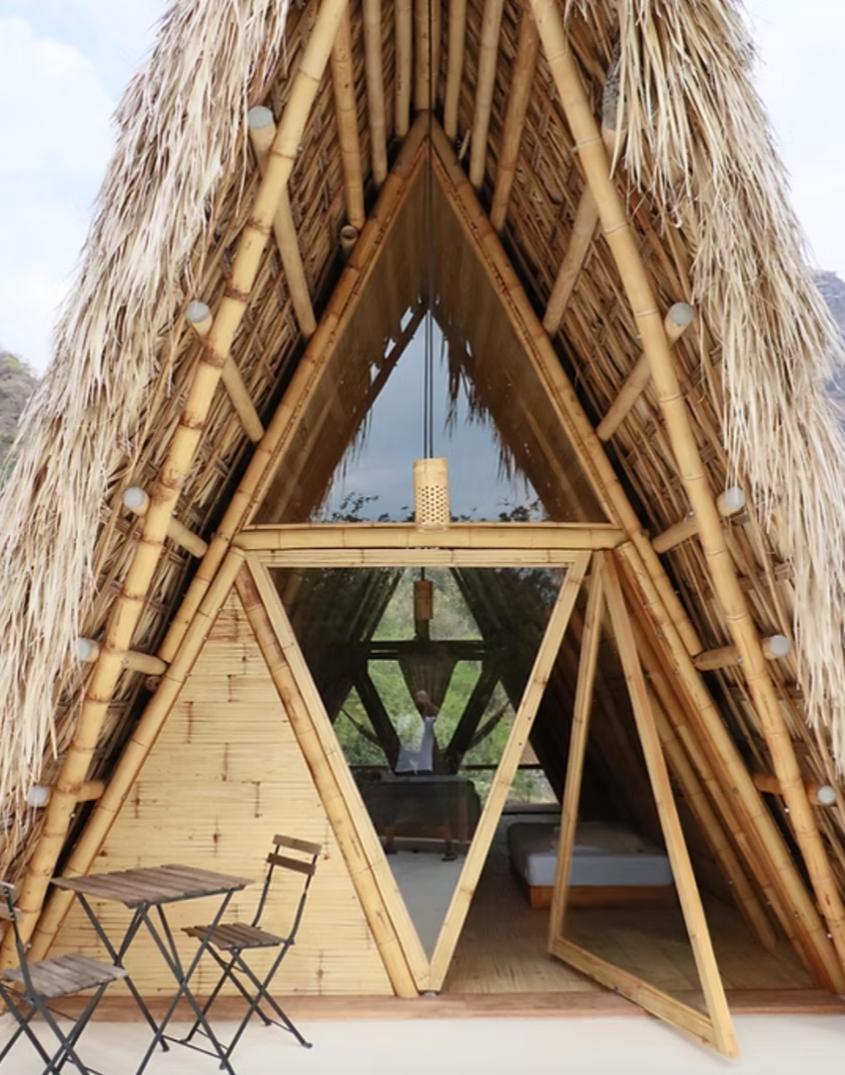 Bamboo and palm, triangular A-frame, bedroom above and balcony below. You wake up at eye level with the mountains – and the rest of the day follows that energy.