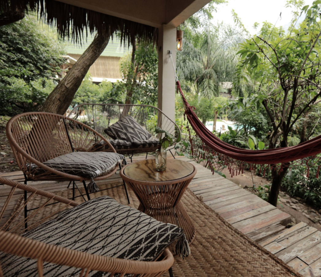 All bamboo, all sky. The most spacious cabin on the property: with a private balcony, terrace, and the kind of mountain view that makes you forget why you came. Then reminds you.